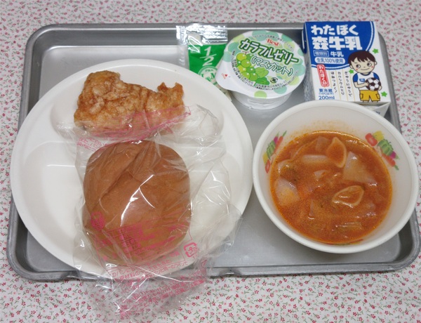今日は、9月のお誕生日給食でした。メニューは、セルフチキン南蛮バーガー、ミネストローネ、マスカットゼリー、牛乳です。自分でパンにチキンを挟みタルタルソースをかけておいしくいただきました。