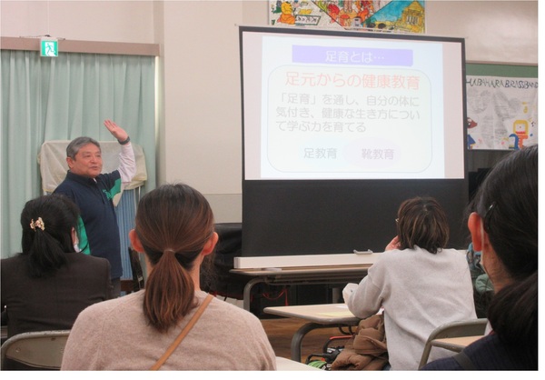 足育推進委員会より講師をお招きし、「足元からの健康づくり」というテーマで学校保健員会を開催しました。足と靴があっていない場合、足のトラブルにつながる、正しい靴の履き方で生活がよくなっていくとのお話がありました。足形を測定し靴の履き方についてのアドバイスをもらったり、正しい靴の履き方を習ったりしました。
