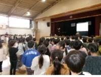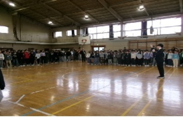 「はじまりの歌」で音楽朝会がスタートしました。今月の歌「君をのせて」を強弱をつけることに気を付けて歌いました。p(ピアノ)の時にはしゃがむ、f(フォルテ)の時には立つなど、体も使って表現することができました。寒い日でしたが、明るい声が体育館に響きました。
