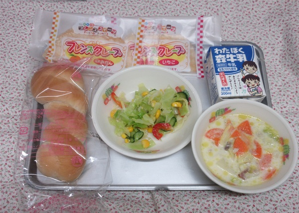今日の献立は、「ツイストパン、ミルクスープ、コールスローサラダ、セレクトデザート(クレープ)、牛乳」です。