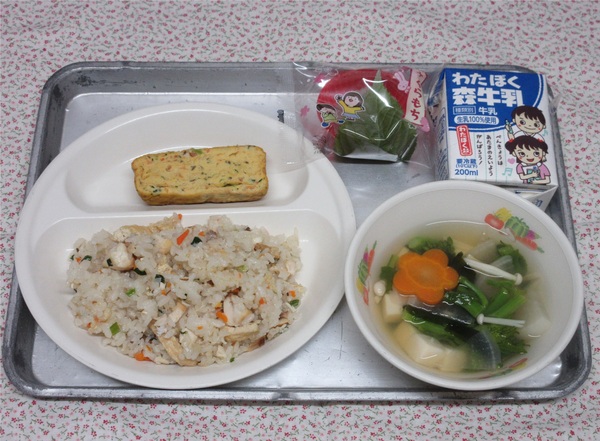 今日の献立は、「鯛めし、具だくさん玉子焼き、菜の花入りすまし汁、桜餅、牛乳」です。