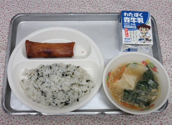 献立は、「わかめごはん、春巻き、ワンタンスープ、牛乳」です。