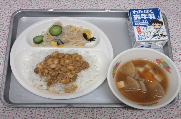 献立は、「ソイ丼、こんにゃくサラダ、さつま汁、牛乳」です。