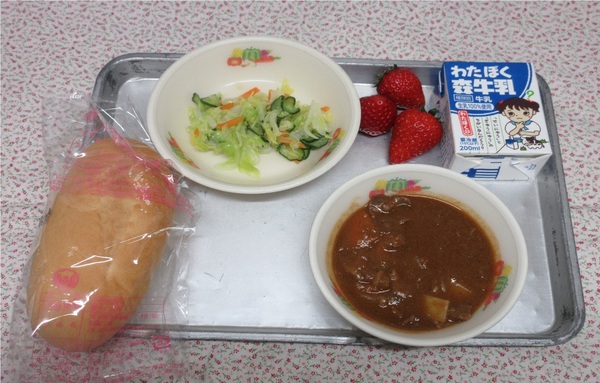 今日は今年度最後の給食でした。献立は、「ソフトフランスパン、ビーフシチュー、フレンチサラダ、いちご、牛乳」です。各クラスではそれぞれみんなで楽しく食べられるよう座席を工夫していました。